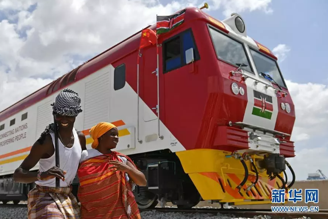 2017年1月11日,在肯尼亞蒙巴薩,當(dāng)?shù)孛癖娫谥袊?guó)承制的蒙內(nèi)鐵路首批內(nèi)燃機(jī)車(chē)旁載歌載舞。新華社記者孫瑞博攝