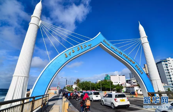 2018年10月2日,車(chē)輛從由中國(guó)援建、連接馬爾代夫首都馬累和機(jī)場(chǎng)島的中馬友誼大橋橋頭拱門(mén)穿過(guò)。新華社發(fā)(杜才良 攝)