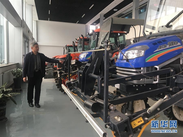 孫斌在公司查看農(nóng)機具(2月2日攝)。新華社記者 王君寶 攝