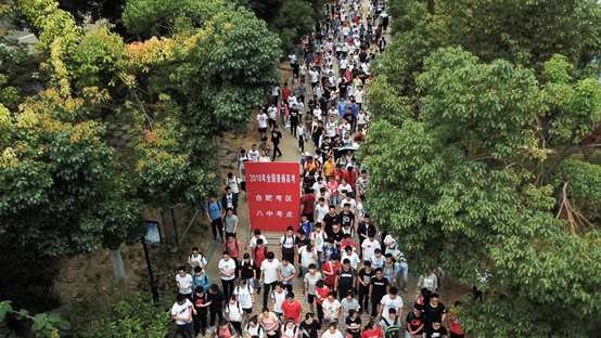 2018年6月7日,高考首場科目考試結(jié)束。在安徽省合肥市第八中學考點,完成第一門考試的考生走出考場(無人機拍攝)。 新華社記者張端攝