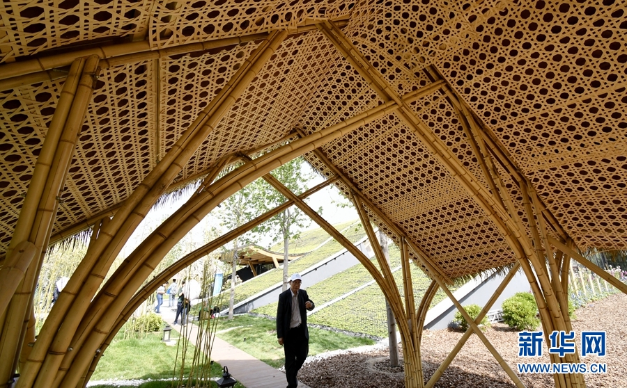 5月16日,游人在北京世園會國際竹藤組織園參觀。 當(dāng)日,由國際竹藤組織主辦的榮譽(yù)日活動在北京世園會園區(qū)的國際竹藤組織園舉行。 新華社記者 李欣 攝