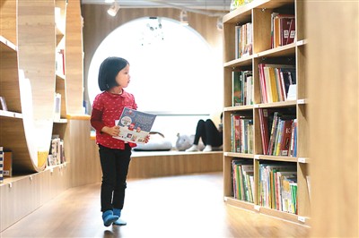 繪本圖書館里,孩子坐在家長身旁,捧著手中的書讀得津津有味。場館設計之初,王慧瑾親自“操刀”,定下了原木簡約風格的主基調,就是為了滿足家長的高品質審美需求,力圖打造一個家長和孩子都可以樂在其中的悠閑天地。