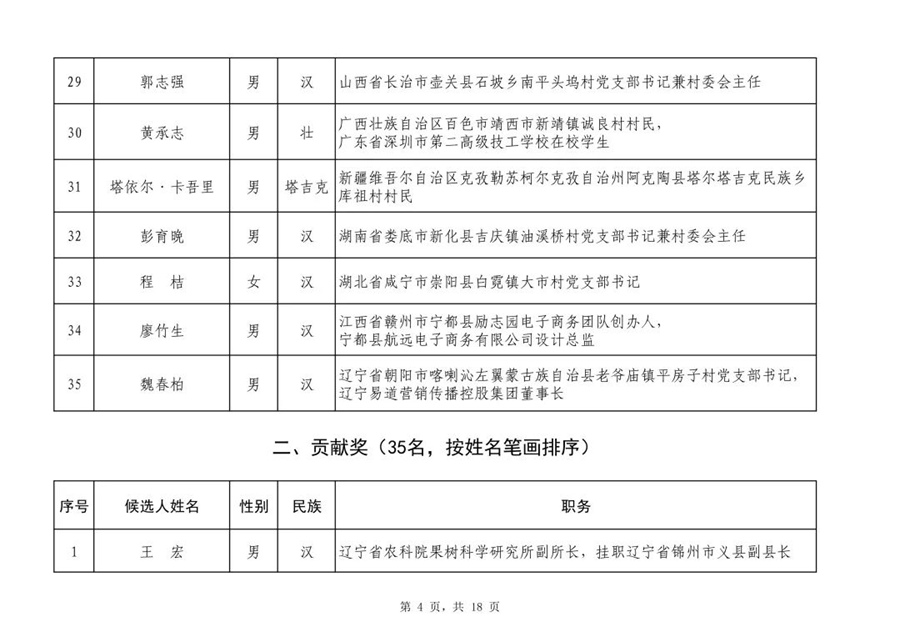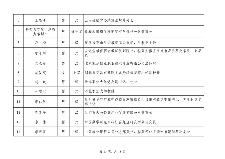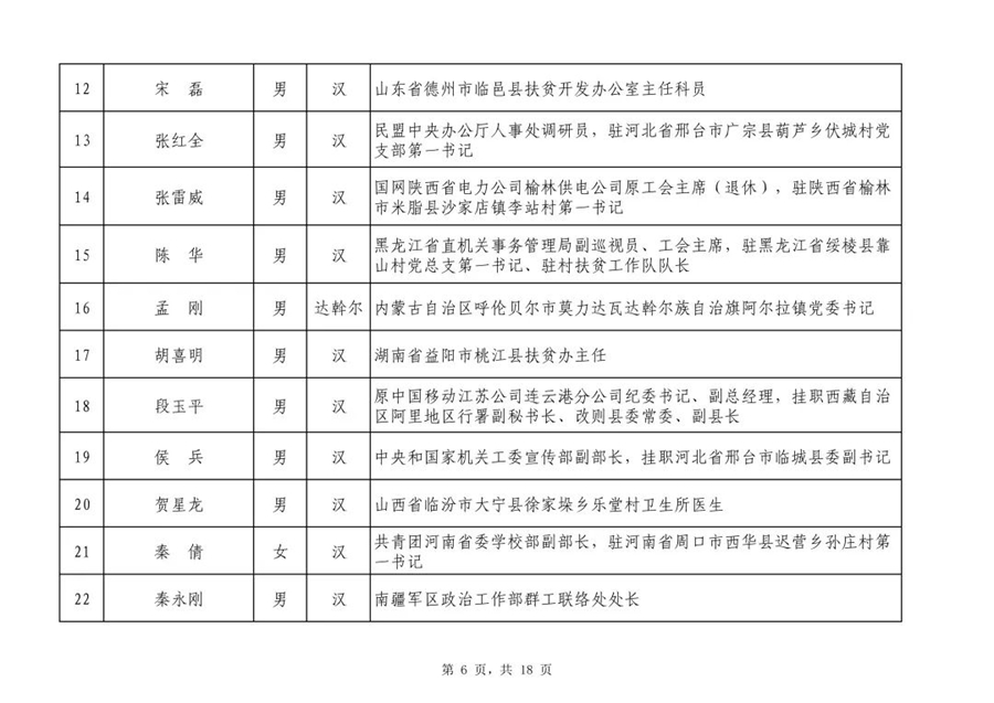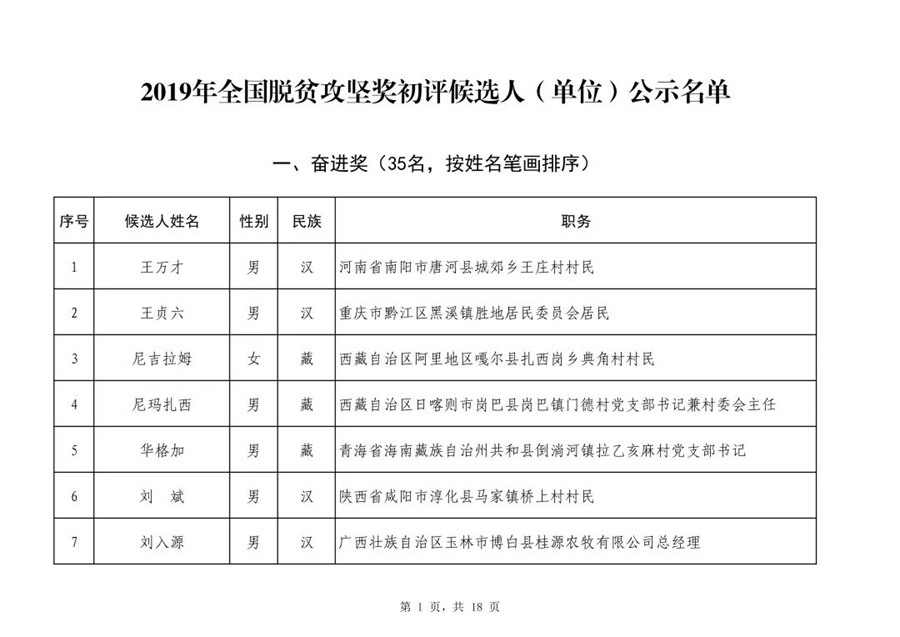 根據(jù)國務(wù)院扶貧開發(fā)領(lǐng)導(dǎo)小組印發(fā)的《2019年全國脫貧攻堅(jiān)獎評選表彰工作方案》,經(jīng)全國脫貧攻堅(jiān)獎評選委員會初次評審,以下140名人選和59個單位作為2019年全國脫貧攻堅(jiān)獎初評候選人(單位),現(xiàn)予以公示。