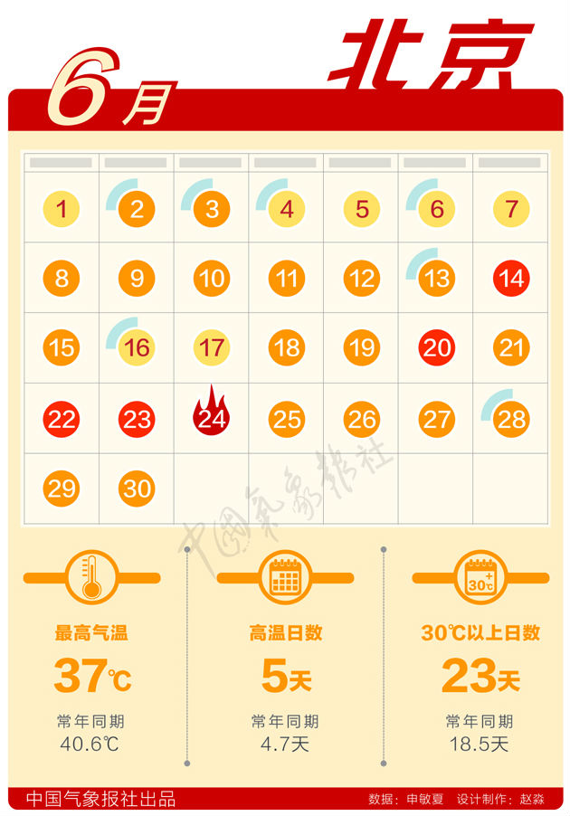 北京:2019年6月,北京南郊觀象臺(tái)觀測(cè)到高溫日數(shù)為5天,與常年4.7天差不多。最高氣溫37℃,尚未突破歷史極值40.6℃,但超過30℃的天數(shù)23天,比同期18.5天偏多,且6月22日到6月24日連續(xù)3天出現(xiàn)高溫日數(shù)。