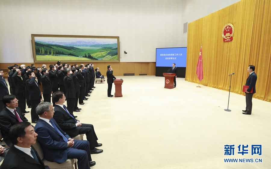 根據《中華人民共和國憲法》和《國務院及其各部門任命的國家工作人員憲法宣誓組織辦法》,2018年11月至2019年6月國務院任命的25個部門和單位的28名負責人依法進行憲法宣誓。