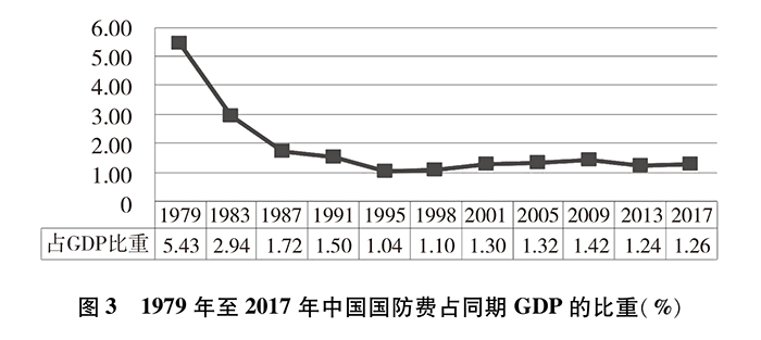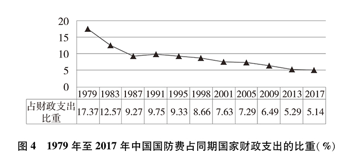 改革開放以來,中國國防開支經歷了從維持性投入到適度增長的發展歷程,總體保持與國家經濟和財政支出同步適度協調增長。國防費占國內生產總值(GDP)比重從1979年最高的5.43%下降到2017年的1.26%,近30年一直保持在2%以內。1979年國防費占國家財政支出比重為17.37%,2017年為5.14%,下降超過12個百分點,總體下降趨勢明顯。