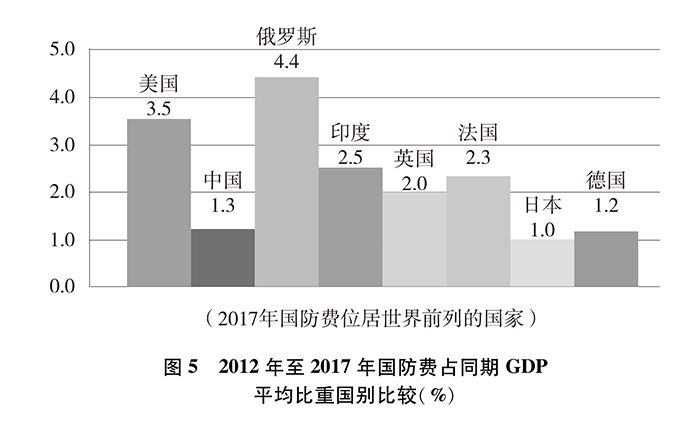 從國防費占國內生產總值比重看,2012年至2017年,中國國防費占國內生產總值平均比重約為1.3%,美國約為3.5%、俄羅斯約為4.4%、印度約為2.5%、英國約為2.0%、法國約為2.3%、日本約為1.0%、德國約為1.2%。中國國防費占國內生產總值的平均比重在國防費位居世界前列的國家中排在第六位,是聯合國安理會常任理事國中最低的。
