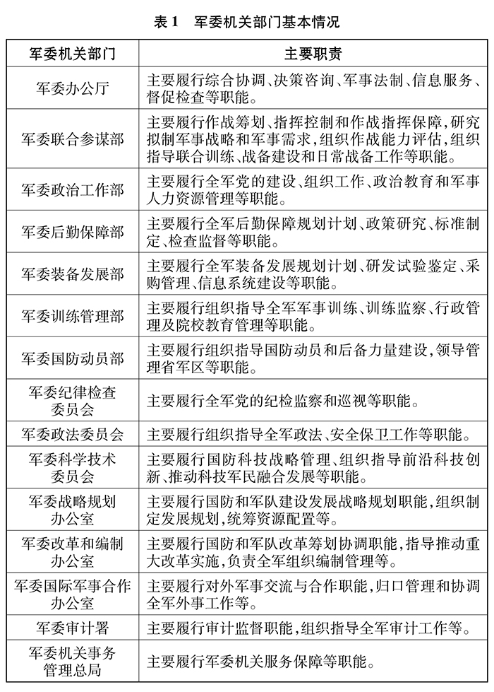調整組建新的軍委機關部門。優化軍委機關職能配置和機構設置,由過去的總參謀部、總政治部、總后勤部、總裝備部四總部調整為軍委機關15個職能部門,作為軍委集中領導的參謀機關、執行機關、服務機關。指揮、建設、管理、監督等路徑更加清晰,決策、規劃、執行、評估等職能配置更加合理。