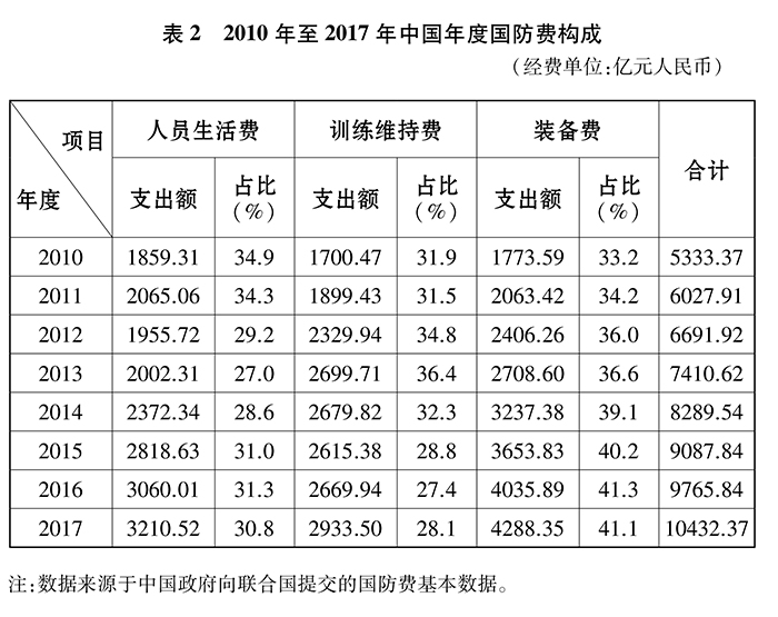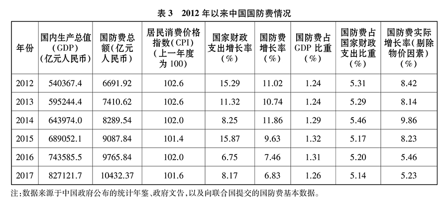 2012年至2017年,中國國防費從6691.92億元人民幣增加到10432.37億元人民幣。中國國內生產總值(GDP)按當年價格計算年平均增長9.04%,國家財政支出年平均增長10.43%,國防費年平均增長9.42%,國防費占國內生產總值平均比重為1.28%,占國家財政支出平均比重為5.26%。國防費占國內生產總值的比重穩定,與國家財政支出保持同步協調增長。