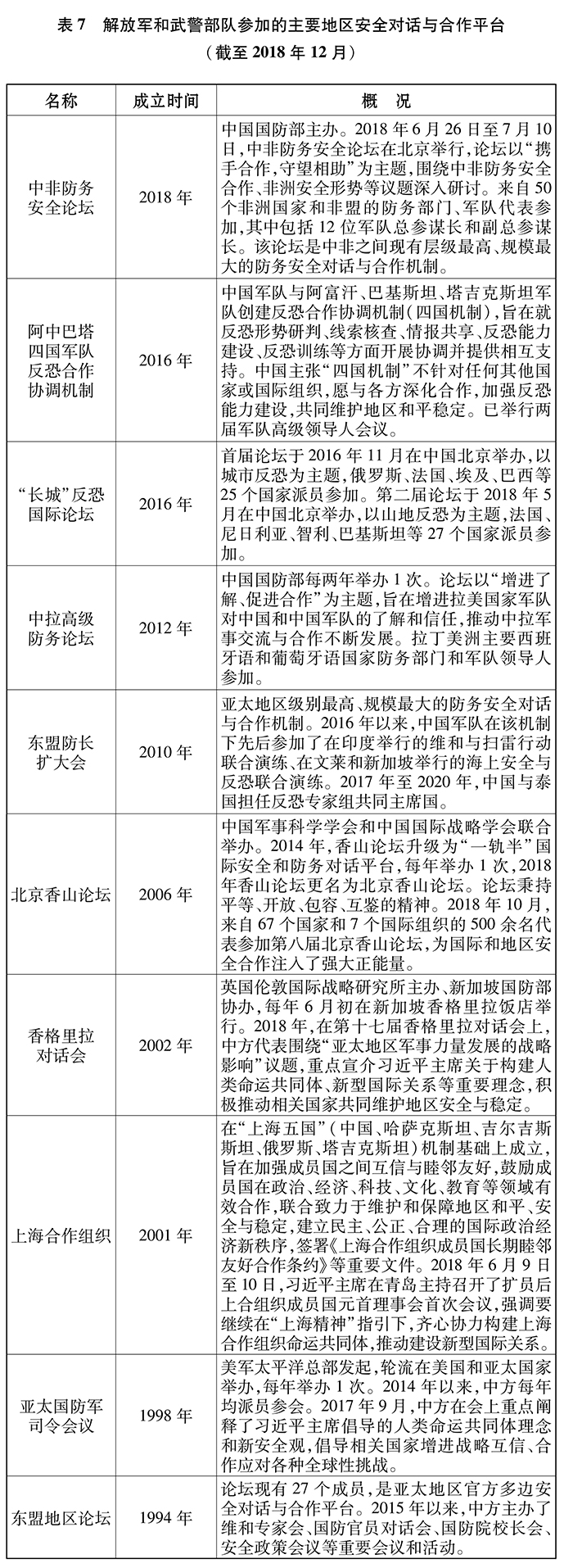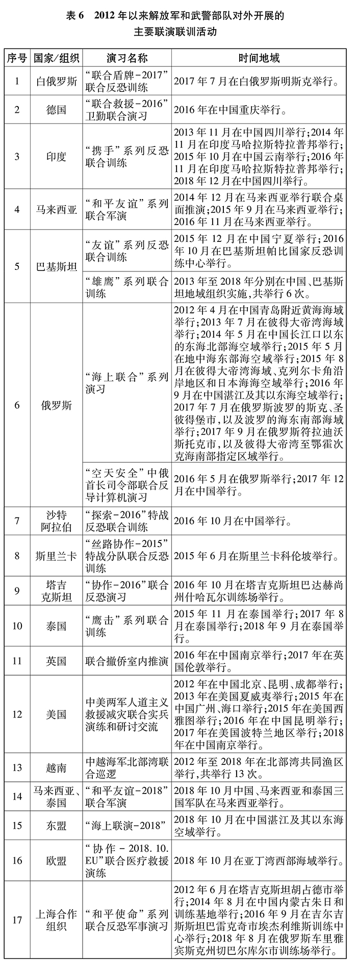 中國軍隊堅持互信互惠、合作共贏的原則,同世界各國軍隊開展務實交流合作。2012年以來,中國同30多個國家舉行百余次聯合演習與訓練,演練內容從非傳統安全領域發展到傳統安全領域,演練地域從中國周邊延伸至遠海,參演力量從以陸軍為主拓展至陸海空多軍兵種。中國軍隊積極組織人才培養交流合作,2012年以來,向50多個國家派出軍事留學生1700余名,20余所軍隊院校分別同40多個國家的院校建立和保持了校際交流關系,共接納130多個國家的上萬名軍事人員到中國軍隊院校學習。