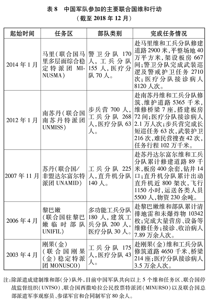 中國積極支持聯合國維和行動,是聯合國維和行動的主要出資國之一,是安理會常任理事國中第一大出兵國。截至2018年12月,中國軍隊已累計參加24項聯合國維和行動,派出維和軍事人員3.9萬余人次,13名中國軍人犧牲在維和一線。中國軍隊在維和任務區新建、修復道路1.3萬余千米,排除地雷及各類未爆物10342枚;運送物資135萬余噸,運輸總里程1300萬余千米;接診病人17萬余人次;完成武裝護衛、長短途巡邏等任務300余次。