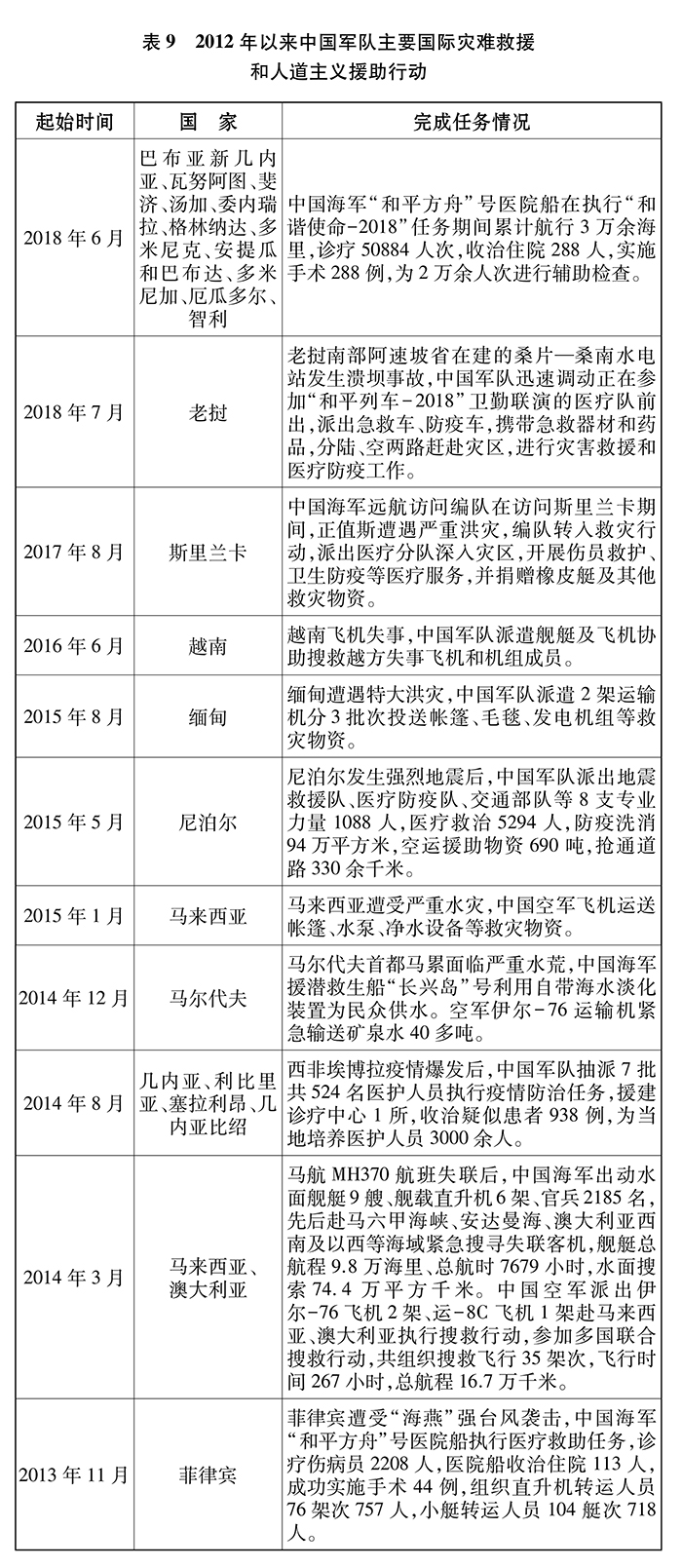中國軍隊積極參加國際災難救援和人道主義援助,派遣專業救援力量赴受災國救援減災,提供救援物資和醫療救助,加強救援減災國際交流。2012年以來,組織或參加馬航MH370失聯航班搜救、菲律賓“海燕”臺風救援、抗擊西非埃博拉疫情、馬爾代夫水荒救援、尼泊爾抗震救災、老撾水災潰壩救援等多項行動。中國海軍“和平方舟”號醫院船服役10年來,執行7次“和諧使命”任務,共訪問43個國家,為到訪國民眾提供醫療服務,組織醫學交流,惠及民眾23萬余人次。
