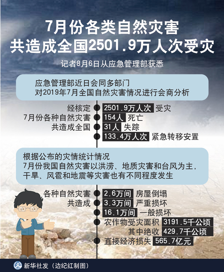 新華社北京8月6日電(記者葉昊鳴)記者6日從應(yīng)急管理部獲悉,應(yīng)急管理部近日會同多部門對2019年7月全國自然災(zāi)害情況進行會商分析。經(jīng)核定,7月份各種自然災(zāi)害共造成全國2501.9萬人次受災(zāi),154人死亡,31人失蹤,133.4萬人次緊急轉(zhuǎn)移安置。