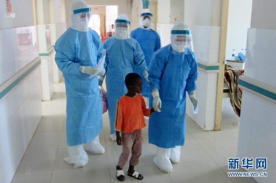 2014年10月11日,在塞拉利昂首都弗里敦,來自中國的醫護人員護送埃博拉留觀患者進入病房。新華社發(孫捷 攝)