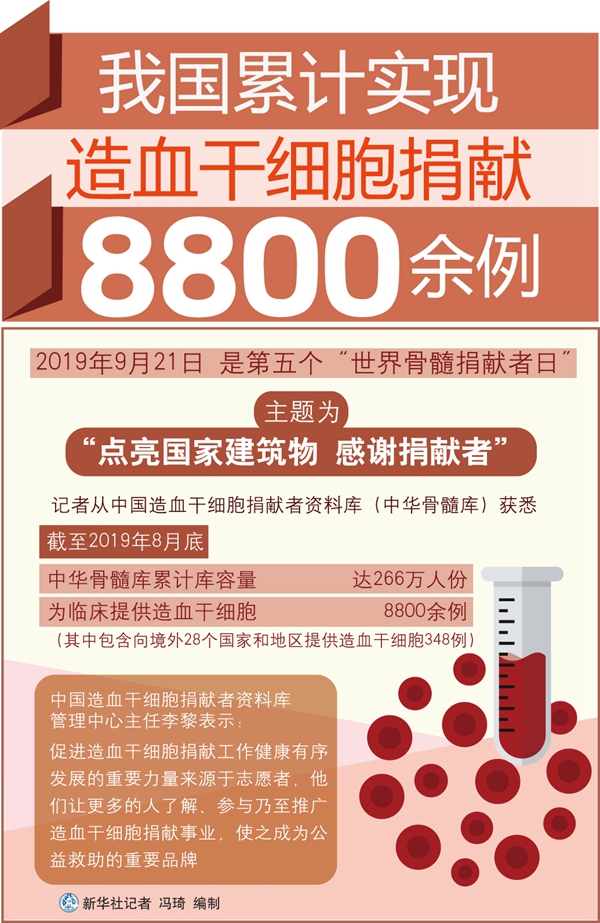 新華社西安9月21日電(記者藺娟 吳鴻波)記者從中國(guó)造血干細(xì)胞捐獻(xiàn)者資料庫(kù)(中華骨髓庫(kù))獲悉,截至2019年8月底,中華骨髓庫(kù)累計(jì)庫(kù)容量已達(dá)266萬(wàn)人份,為臨床提供造血干細(xì)胞8800余例,其中包含向境外28個(gè)國(guó)家和地區(qū)提供造血干細(xì)胞348例。