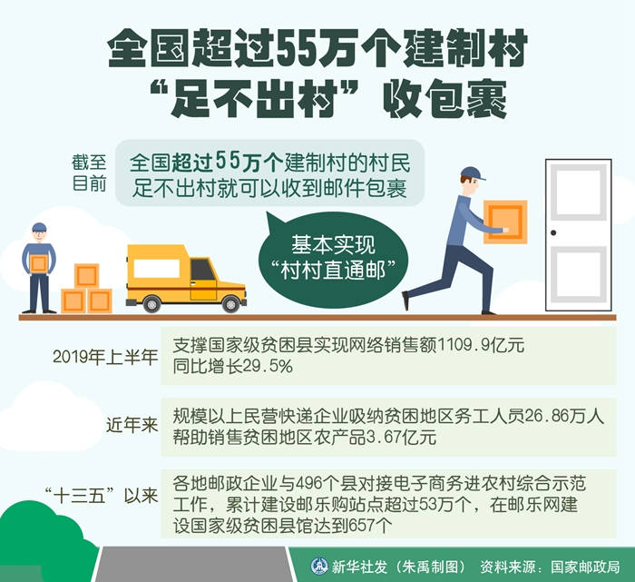 新華社北京10月23日電(記者 趙文君)“雙11”快遞旺季即將到來,記者23日從國家郵政局獲悉,截至目前,全國超過55萬個建制村的村民足不出村就可以收到郵件包裹,基本實現“村村直通郵”。郵政、快遞成為農產品上行的重要力量,農村寄遞實現了從“寄包裹”到“產包裹”的轉變,真正搞活了農產品流通。