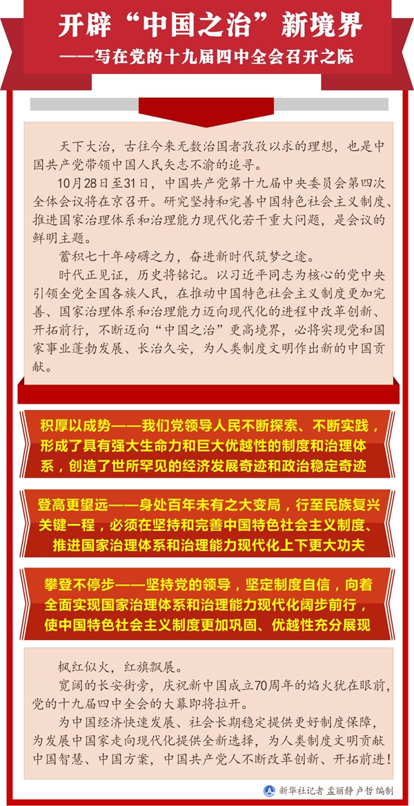 新華社北京10月27日電 題:開辟“中國(guó)之治”新境界——寫在黨的十九屆四中全會(huì)召開之際