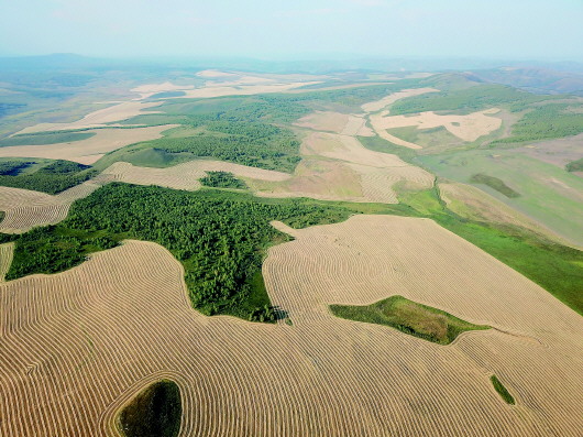 站在山腳下仰望,只見碧綠的山地草原上,麥田從山溝一直延伸到山坡,黃綠撞色十分扎眼。用無人機從空中俯瞰,這些農田就像一道道傷疤。