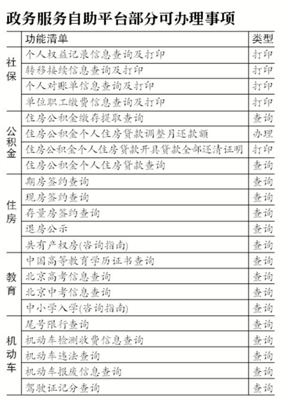 日前,北京市政務服務局在城六區及通州區政務服務中心和部分街道、社區配置100臺自助服務終端。市民調整公積金貸款月還款額,查詢及打印個人權益記錄信息、單位職工繳費信息、個人信用記錄報告,打印電子營業執照影印件等上百項業務均可自助辦理。