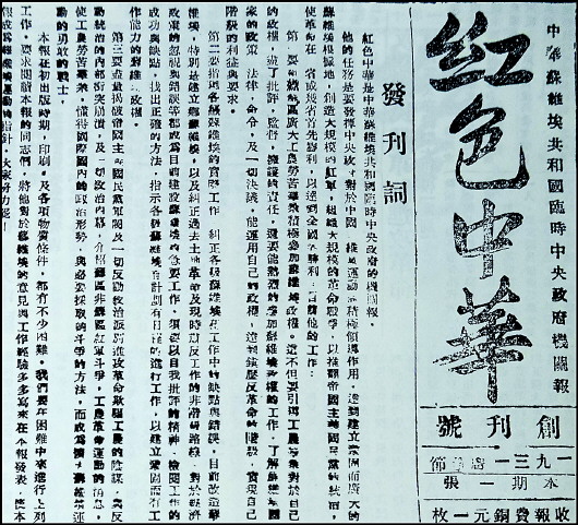 一個月后的12月11日,中華蘇維埃共和國臨時中央政府機關報《紅色中華》創刊。1932年2月4日起,《紅色中華》改為中國共產黨蘇區中央局、中國共產主義青年團蘇區中央局、中華蘇維埃中央政府、全總蘇區執行局合辦的中央機關報。
