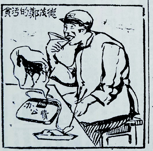 此事被揭露后,《紅色中華》在第134期發表了一幅《貪污分子鄭德茂》漫畫,畫中戴著五角星帽子用“辦公費”大吃大喝的鄭茂德,腦海里正想著一匹騾子,貪污分子的丑陋形象躍然紙上。