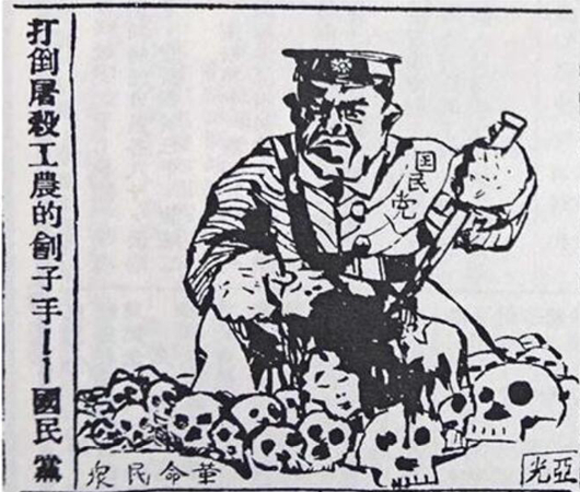 1933年7月14日,《紅色中華》第1版刊發潘漢年撰寫的社論《反對國民黨法西斯的白色恐怖》,文章配發黃亞光創作的漫畫《打倒屠殺工農的劊子手——國民黨》,畫面上的國民黨兇手舉著滴血的屠刀,踏著一堆革命群眾的尸骨,將國民黨反動派與人民為敵的本性揭露無遺。