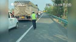 在湖北,一名交警停車拾起掉落在高速公路上的國旗。