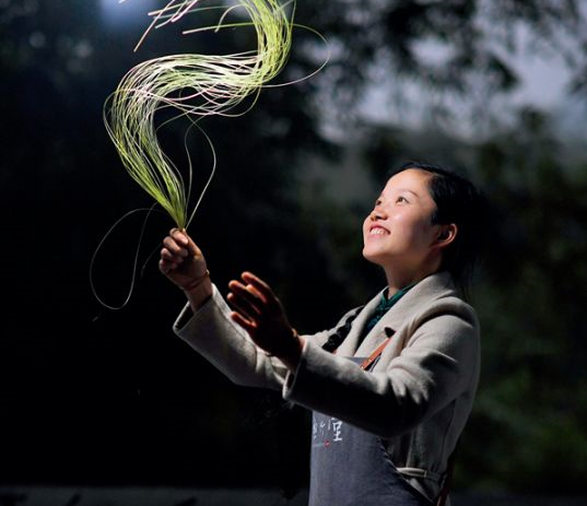 貴州省級非物質文化遺產“赤水竹編”傳承人楊昌芹在展示新制作的竹絲(2019 年11 月11 日攝)。赤水市現有竹林面積132.8 萬畝,竹產業是當地農民增收的重要渠道之一 楊文斌 攝