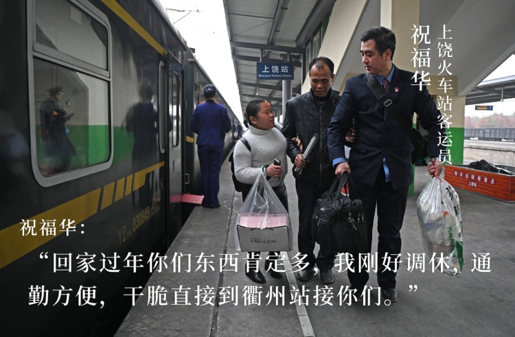 祝福華是上饒火車站的一名客運員,經(jīng)常在車站碰到他們,每次都熱心地幫忙提行李,護送進出站,日子久了就互相留了電話和微信以方便聯(lián)系。只要魯師傅夫婦有需要,即便沒在班上,祝福華也會趕到車站幫助他們。