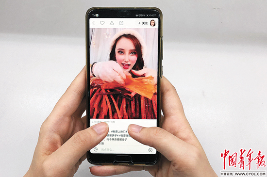 一位消費(fèi)者在查看手機(jī)里關(guān)于網(wǎng)紅食品的視頻。中青報(bào)·中青網(wǎng)記者 李崢苨/攝