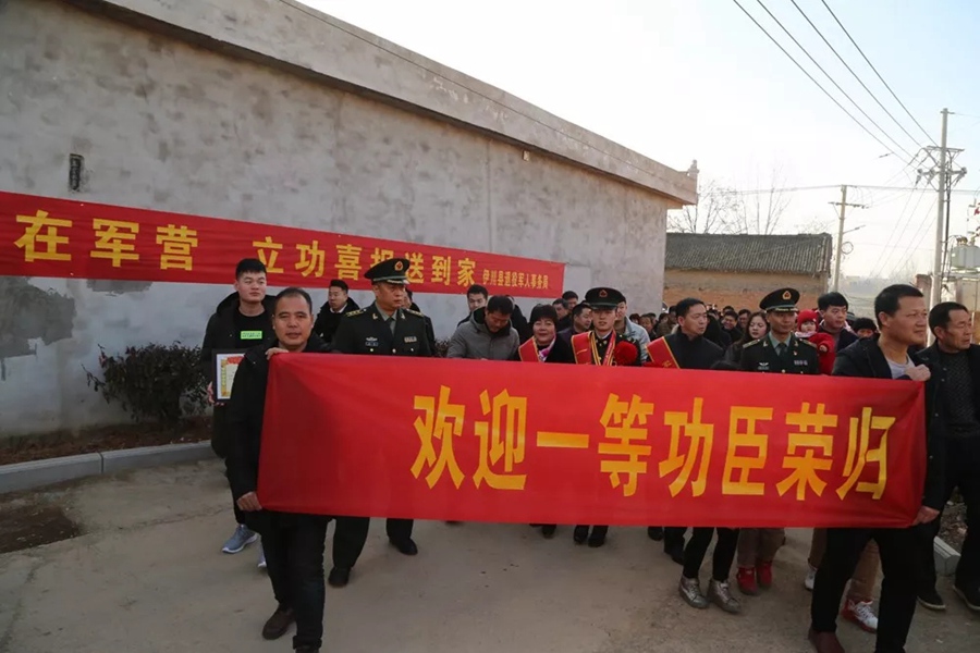 功臣黃曉龍和父母在各級領導和村民的簇擁下回到家中