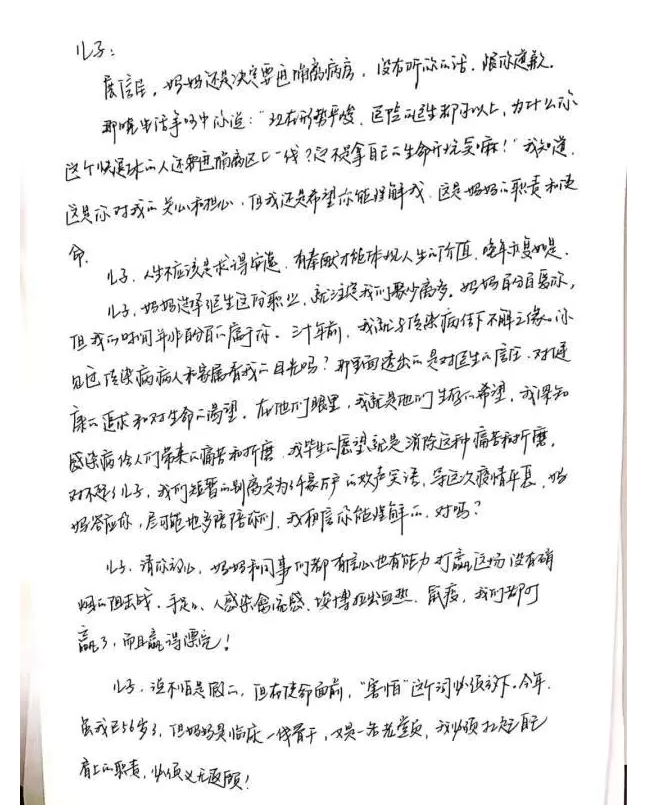 醫生曹曉英表示,這封信是在進入隔離區前寫下留給兒子的。整個醫療團隊有24名醫生,30多名護士,也和她一樣,大家住在醫院,與家人分離。