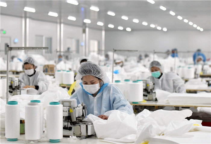 1月28日,在仙桃市湖北裕民防護用品有限公司生產車間內,工人在加緊生產醫用防護用品。 新華社記者 李賀 攝