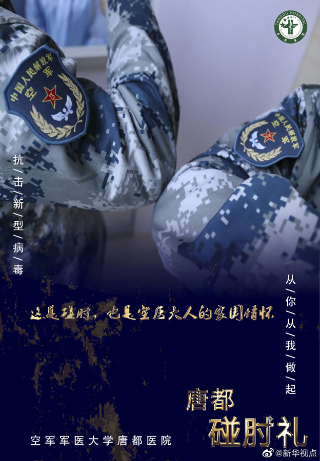 疫情當前,空軍軍醫大學唐都醫院的醫護人員在抗擊疫情的同時,用新的肢體語言——“碰肘禮”,相互問候,相互加油。肘碰肘,心連心,萬眾一心,定能戰勝病毒。(文字藺娟;圖片由空軍軍醫大學唐都醫院提供) ????