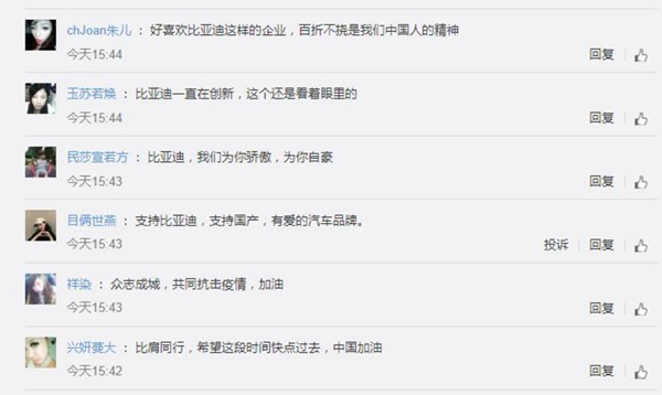 對于比亞迪汽車跨界造口罩一事,網友紛紛表示:“眾志成城,共同抗擊疫情”“百折不撓是中國人的精神”“希望這段時間快點過去,中國加油”。