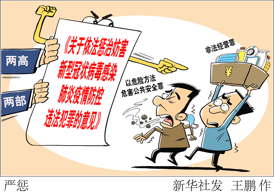 2月10日,最高人民法院、最高人民檢察院、公安部、司法部聯合發(fā)布關于依法懲治妨害新型冠狀病毒感染肺炎疫情防控違法犯罪的意見,針對當前突出的涉疫情防控違法犯罪,統(tǒng)一執(zhí)法標準、程序、依據,并強調加強治安管理、市場監(jiān)管等執(zhí)法工作,加大對暴力傷醫(yī)違法犯罪行為打擊力度。 新華社發(fā) 王鵬 作