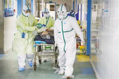 近日,武漢市蔡甸區(qū)人民醫(yī)院醫(yī)護(hù)人員在轉(zhuǎn)運(yùn)新冠肺炎重癥病人。陳 卓攝(影像中國)