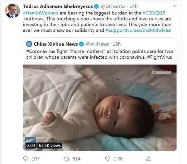 ↑世界衛生組織總干事譚德塞轉發新華社海外社交媒體英文主賬號稿件《隔離點里的“臨時媽媽”》,贊譽中國醫護人員在新冠肺炎防治工作中付出的努力和愛心。
