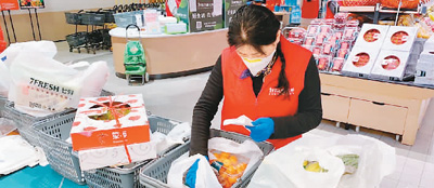 線上果蔬訂單增多,京東七鮮超市的工作人員正加緊分裝物品。圖片來源:京東