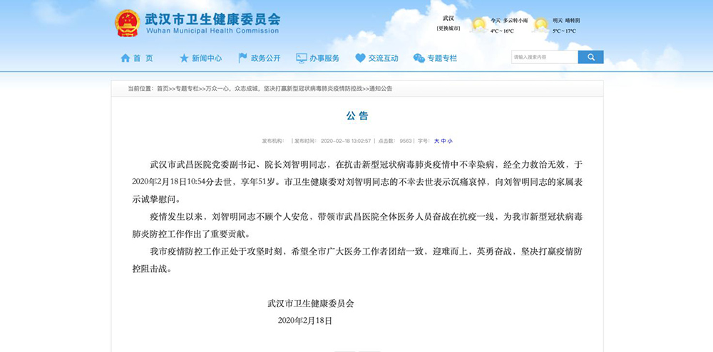 2月18日中午,武漢市衛(wèi)健委發(fā)布公告,武漢市武昌醫(yī)院黨委副書記、院長(zhǎng)劉智明同志,在抗擊新型冠狀病毒肺炎疫情中不幸染病,經(jīng)全力救治無效,于2020年2月18日10:54分去世,享年51歲。