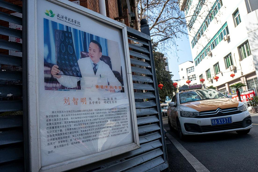 2月21日,劉智明院長(zhǎng)的宣傳照依然掛在醫(yī)院樓下。(新華社記者熊琦攝)