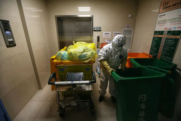 但是醫(yī)療廢棄物產生的速度實在太快,一線醫(yī)務工作者用完的防護服、口罩、鞋套……病人的生活垃圾,病人的餐余垃圾,病人的嘔吐物等等感染性廢棄物都要快速處理,醫(yī)療廢棄物產生的速度已超過了后勤部門正常的處理速度。周師傅介紹稱,ICU中的保潔員會將感染性醫(yī)療廢棄物集中放在指定處理間的黃色垃圾桶中,然后他們有四位師傅每天早上六點到下午五點會在整個院區(qū)不停地轉運黃色垃圾桶,然后還會安排專人值班,晚上只要接到院內科室電話就會趕過去把黃色垃圾桶運出來,他們已經(jīng)保證24小時隨時有人在崗負責處理醫(yī)療廢棄物了,“我們不拼命不行啊,這是人命關天的事。”周師傅稱。