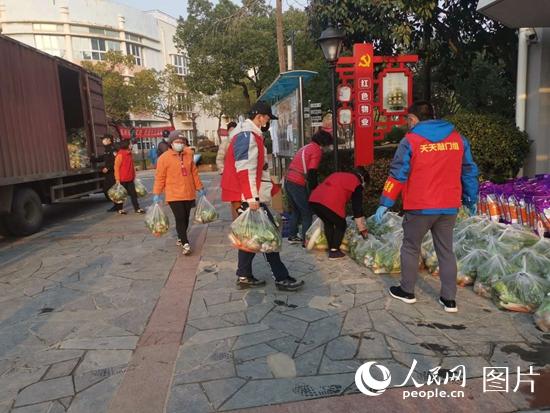 志愿者鄧偉龍在綠景苑社區搬運蔬菜。人民網湖北頻道金雨蒙 攝
