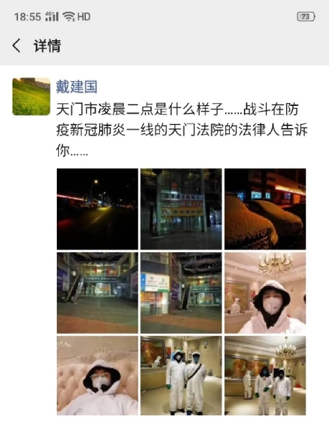 2月5日,天門市委發(fā)出全市干部職工就近參加村(社區(qū))疫情防控工作的號召后,天門法院黨組認(rèn)真組織,狠抓落實(shí)。戴建國積極響應(yīng),第一時間趕到竟陵街道辦事處鴻漸社區(qū)報到,被安排到新城集中留觀點(diǎn)某酒店值班。