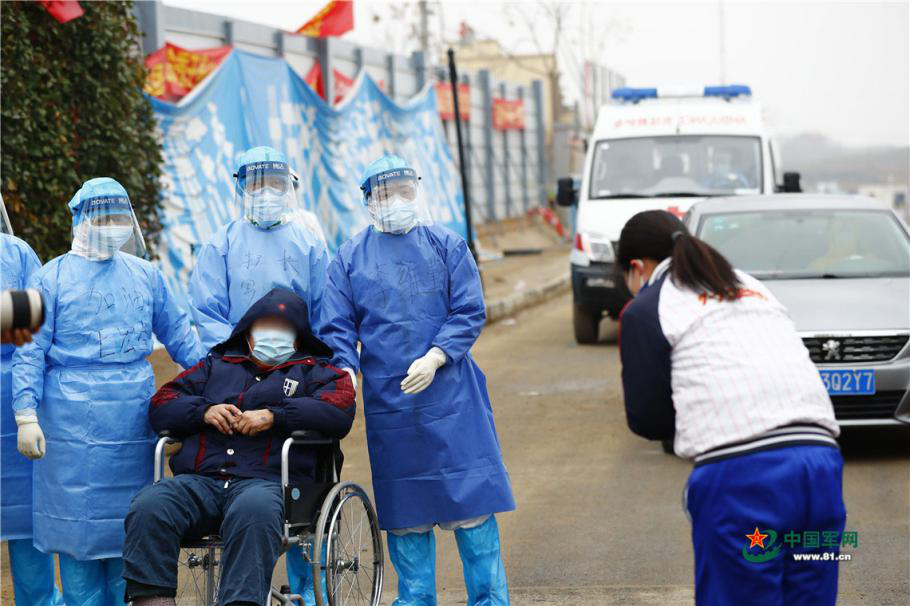 2月27日中午時分,從火神山醫(yī)院傳出好消息,經(jīng)過醫(yī)護(hù)人員20多天的科學(xué)救治和精心護(hù)理,又有76名新冠肺炎確診患者康復(fù)走出火神山醫(yī)院,是目前該院單日出院人數(shù)最多的一天。圖為患者家屬向醫(yī)護(hù)人員致敬。王皓宇 攝