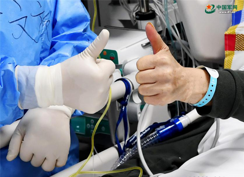 火神山醫(yī)院重癥醫(yī)學(xué)一科自2月10日開始收治重癥患者以來,全科醫(yī)護(hù)人員不畏風(fēng)險全力救治,他們根據(jù)患者病情的變化,有預(yù)見性地快速調(diào)整救治方案,采取呼吸支持、抗病毒、維護(hù)臟器功能、加強(qiáng)營養(yǎng)等方法,使重癥患者逐漸有了好轉(zhuǎn),提高了救治成功率?;ハ喙膭铧c(diǎn)贊,是在重癥室看到最多的場景。解放軍報(bào)記者王傳順 攝
