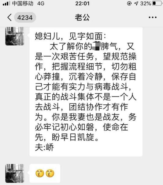 軍隊(duì)支援湖北醫(yī)療隊(duì)隊(duì)員彭渝瞞著家人馳援武漢,丈夫直到看見別人發(fā)的照片,才知道她已經(jīng)出發(fā)。兩人在電話里大吵一架,冷靜之后,同為軍人的丈夫給彭渝發(fā)了一條微信“你是我妻也是戰(zhàn)友,盼凱旋!”看到微信,彭渝落淚……