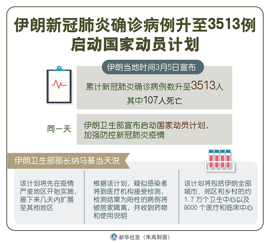 新華社德黑蘭3月5日電(記者陳霖)伊朗5日宣布累計新冠肺炎確診病例數(shù)升至3513人。同一天,伊朗衛(wèi)生部宣布啟動國家動員計劃,加強(qiáng)防控新冠肺炎疫情。