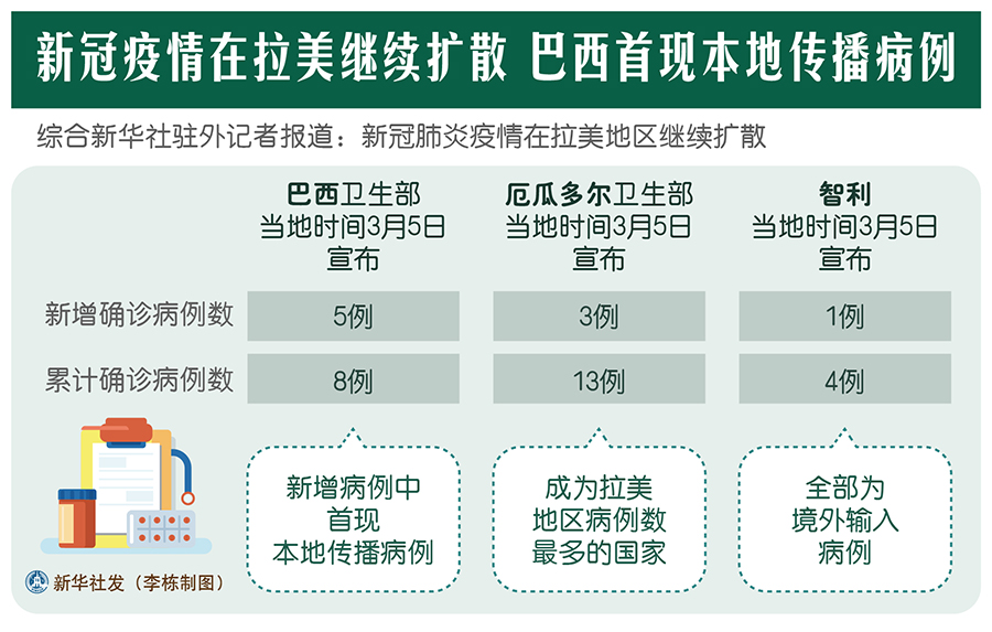 新華社墨西哥城3月5日電? 綜合新華社駐外記者報道:新冠肺炎疫情在拉美地區(qū)繼續(xù)擴散。巴西政府5日宣布該國首現(xiàn)本地傳播病例,厄瓜多爾、智利和阿根廷確診病例數(shù)量也在增加。拉美多國紛紛提升防控力度,加強應(yīng)對措施。