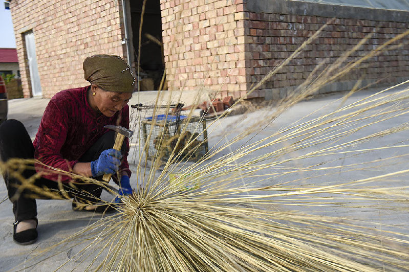李耀梅在加固掃帚(2019年4月28日攝)。新華社發(fā)(馮開(kāi)華 攝)